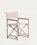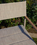 Estructura de aluminio (ligera y resistente a la oxidación y la corrosión) Asiento y respaldo en texteline (tejido sintético transpirable, apto para exterior) Detalles en reposabrazos en polimadera |