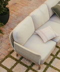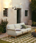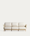 El Sofá Alipa 3 plazas madera y cuerda combina la calidez natural de la madera maciza de acacia con el confort de un asiento trenzado a mano en cuerda crudo. Diseñado para integrarse en terrazas y jardines con un aire mediterráneo y elegante, ofrece un confort duradero con cojines desenfundables y materiales resistentes al uso exterior.